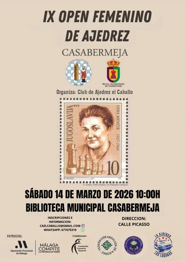 Casabermeja volverá a ser punto de encuentro del ajedrez femenino con la celebración del IX Open Femenino de Ajedrez de Casabermeja, que tendrá lugar el sábado 14 de marzo de 2026 a las 10:00 horas en la Biblioteca Municipal. El torneo está organizado por el Club de Ajedrez El Caballo y se consolida como una cita destacada para la promoción del deporte femenino en la comarca.